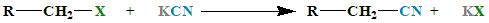 Here, bromoethane (ethyl bromide) reacts with potassium cyanide to form propionitrile (ethyl cyanide).