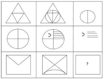 The correct answer is Option (2) → It completes the pattern by combining the key elements used across the matrix (the triangular outline and the curved arc at the bottom) in the same transformation style seen in the other rows and columns. |