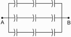 Each of the capacitors shown in the figure has a capacitance of 3 μF. The equivalent capacitance of the assembly between the points A and B is