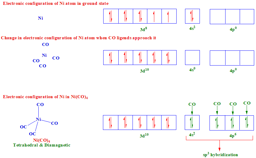 The correct answer is option 2. \(sp^3\). The valence shell electronic configuration of ground state \(Ni\) atom is \(3d^8 4s^2\). All of these 10 electrons are pushed into \(3d\) orbitals and get paired up when strong field \(CO\) ligands approach \(Ni\) atom. The empty \(4s\) and three \(4p\) orbitals undergo \(sp^3\) hybridization and form bonds with \(CO\) ligands to give \(Ni(CO)_4\). Thus \(Ni(CO)_4\) is diamagnetic.