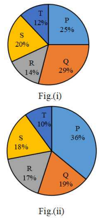 Study the given pie charts and answer the question that follows. The pie charts show the distribution of students of graduate and postgraduate levels in five different institutes P, Q, R, S and T in a town. The difference between the average number of students of graduate level in institutes P, R and T to the average number of students of postgraduate level in institutes P, R and is: |