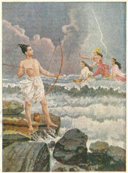 The correct answer is option 1: Valmiki Ramayana Rama Vanquishing the Pride of the Ocean: This is a Puranic (ancient mythological stories) theme painted by Raja Ravi Varma. He was one of the first Indian painters to use oil paint and master the art of lithographic reproduction for mythological subject. These paintings are, generally, large ones, depicting a historic moment or scene from an epic or a classical text, painted in the midst of a dramatic action. It is intended to be noble, momentous and emotional. This scene is taken from Valmiki Ramayana, where Rama needs to build a bridge in southern India to the island of Lanka for his army to cross the ocean. He prays to the God of Ocean, Varuna, to permit him to cross the ocean but Varuna does not respond. Then, in anger, Rama stands to shoot his fiery arrow into the ocean. Immediately, Varuna appears and appeases Rama. The event depicted in this painting sequentially serves as a springboard for the next one. |