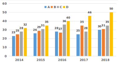 The following bar graph shows the data of the production of an item (in thousand tonnes) from four different companies A, B, C and D during the years mentioned. In the five years given, the average production is highest in company ......... and lowest in company .........., respectively. |