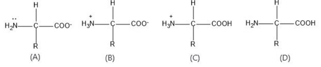 The correct answer is Option (2) → (B) Core Concept Amino acids exist as zwitterions in aqueous solution where they contain both a positive and a negative charge simultaneously. Explanation Option A This form has a negatively charged carboxyl group but the amino group is neutral. It lacks the positive charge required for zwitterionic nature. Option B This structure contains: