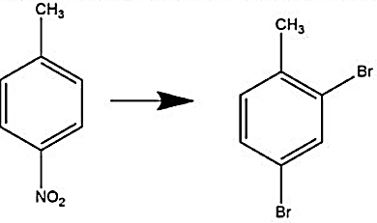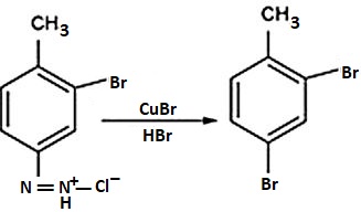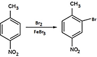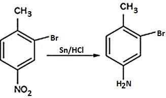 The correct answer is Option (2) → (i) $Br_2/FeBr_3$ (ii) $Sn/HCl$ (iii) $NaNO_2/HCl$ (iv) $Cu_2Br_2/HBr$ In the first step, we can see that when bromine and iron bromide react with 4-nitromethylbenzene, they substitute the hydrogen atoms from the ortho position to the methyl group with bromine. So, the product formed will be: Now, when this mono-brominated product reacts with tin ($Sn$) in the presence of hydrochloric acid ($HCl$), it will reduce the nitro group to the amine group. As we know that in the reduction process, the addition of the hydrogen atom takes place by replacing the oxygen atom, so we will get: Now, the compound formed reacts with sodium nitrite ($NaNO_2$) in the presence of hydrochloric acid ($HCl$) to convert the amine group into a diazonium salt as shown: Now, in the last step, the Gattermann reaction will take place, in which the formation of the aromatic ring takes place to produce halide benzene such as bromobenzene, chlorobenzene, etc. So, the final product formed will be: |