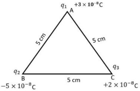 Three point charges are placed at the corners of an equilateral triangle ABC as shown. The work done to put together these charges from infinity to their respective locations is |