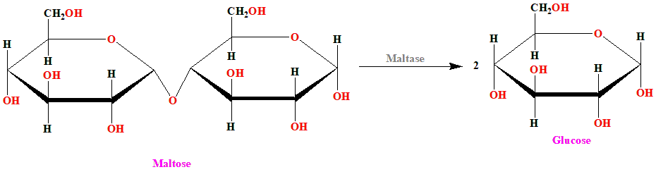 The correct answer is option 2. A and D only. A. Maltase \(\rightarrow\) Glucose: Maltase is an enzyme that belongs to the class of hydrolases, specifically carbohydrases. Its primary function is to catalyze the hydrolysis of maltose, which is a disaccharide composed of two glucose molecules linked together. The reaction catalyzed by maltase can be represented as follows: