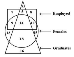 In the given diagram, the shapes indicate the categories of persons. The numbers given in the different segments represent the number of persons in that category. How many females are either graduates or employed but NOT both ? |