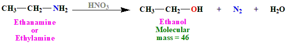 The molecular mass of methanol (\(CH_3OH\)) is \(32\). This doesn't match the given molecular mass of \(46\) for alcohol \(B\). 2. \(CH_3CH_2NH_2\) (Ethylamine) Nitration of ethylamine would result in the formation of ethanol (\(CH_3CH_2OH\)) and nitrogen gas (\(N_2\)). The balanced equation for this reaction is: