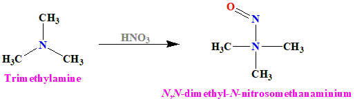 Again, the molecular mass of methanol \((CH_3)_2NNO\) is \(74\), which doesn't match the given molecular mass. 4. \((CH_3)_3N\) (Trimethylamine) Nitration of trimethylamine would result in the formation of N,N-dimethyl-N-nitrosomethanaminium. The balanced equation for this reaction is: