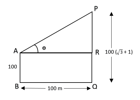 AB + RQ = 100 m Therefore PR = PQ - RQ = 100 (\(\sqrt {3}\) + 1) - 100 = 100 \(\sqrt {3}\) m tan Θ = \(\frac{PR}{AR}\) = \(\frac{100 \sqrt {3}}{100}\) = \(\sqrt {3}\) Θ = 60° sin Θ = \(\frac{PR}{AP}\) ⇒ sin 60° = \(\frac{100 \sqrt {3}}{AP}\) ⇒ AP = \(\frac{100 \sqrt {3}}{sin 60°}\) = \(\frac{100 \sqrt {3}}{\sqrt {3}}\) × 2 = 200 m |