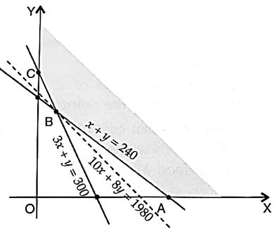 The correct answer is Option (2) → ₹1980 Let x kg of fertiliser A and y kg of fertiliser B be used and Z (in ₹) be the total cost of the two fertilisers, then $Z = 10x + 8y$. The problem can be formulated as an L.P.P. as follows: Minimise $Z = 10x + 8y$ subject to the constraints $\frac{12}{100}x+ \frac{4}{100}y ≥ 12$ i.e. $3x + y ≥ 300$ (nitrogen constraint) $\frac{5}{100}x+ \frac{5}{100}y ≥ 12$ i.e. $x + y ≥ 240$ (phosphoric constraint) $x ≥ 0, y ≥0$ (non-negativity constraints) Draw the lines $3x + y = 300, x + y = 240$ and shade the region satisfied by the above inequalities. The feasible region (unbounded, convex) is shown shaded. The corner points are A (240, 0), B (30, 210) and C(0,300). The values of Z at the corner points are: at $A (240, 0), Z = 10 × 240 + 0 = 2400;$ at $B(30, 210), Z = 10 × 30 + 8 × 210 = 1980;$ at $C(0, 300), Z = 8 × 300 +0 = 2400$. Among values of Z, the least value is 1980. We draw the line $10x + 8y = 1980$ (shown dotted in the given figure) and note that the half plane $10x + 8y < 1980$ has no common points with the feasible region, therefore, Z has minimum value. Minimum value of Z is 1980 and it occurs at the point B (30, 210). Hence, the minimum cost of the fertiliser is ₹1980 when he uses 30 kg of fertiliser A and 210 kg of fertiliser B. |