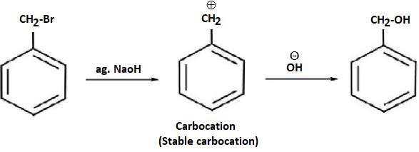 Reaction of $C_6H_5CH_2Br$ with aqueous sodium hydroxide follows. |
