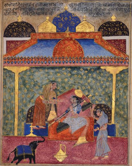 The correct answer is Option (1) → Persian Ragini Pathamsika of Raga Hindola: An intriguing work in the collection of National Museum, New Delhi, titled Ragini Pathamsika of Raga Hindola, an important member of the Ragamala family of the Indian musical mode, dates back to around 1590–95. Some scholars believe it to be from Bijapur, an important state of Deccan. Painting was a highly developed art form in the Deccani states, almost simultaneous with the development of the Mughal School of Painting. Persian influence is obvious in the painting. This is seen in the arabesque decoration on the surface of the two domes that delineate the upper part of the painting, where letters written in Devanagari script cover the space. Two beautifully dressed and bejewelled women are seen in the pavilion, while the third is seen outside it. The centrally placed female musician is playing an Indian instrument, which appears to be veena, while the other two on the sides appear to be accompanying with rhythmic sway of their bodies. The colours are vibrant. Red is dominant and is complimented by green. The figures may be said to be stylised in the sense that the character of their physiology, including the face has been almost constructed on formulaic details. Nearly all forms are deeply emphasied with dark line. This is interestingly observable in the mural paintings of Ajanta, too, which were painted centuries ago. What is also to be noted here is a dark elephant in the left hand corner, with a raised trunk, a delightful sign of welcome. Small in scale, the elephant creates visual interest and breaks the architectonic structuring. |