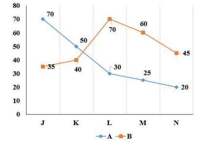 I. The production of sugar by A in years J and K together is 7.69 percent more the production of sugar by B in year L and M together. Production of A by J & K = 70 + 50 = 120 Production of B in L & M = 70 + 60 = 130 Required percentage = \(\frac{120 - 130}{130}\) × 100 = - 7.69% Production in A in J & K is 7.69% less than production by B in L & M Statement I is not correct. II. The ratio of combined production of sugar by B in years M and N to the combined production of sugar by A in years K and L is 21 : 16. Production of B in M & N : Production of A in K & L ( 60 + 45 ) : ( 50 + 30 ) 105 : 80 21 : 16 Statement II is correct. ANs :- Only II |