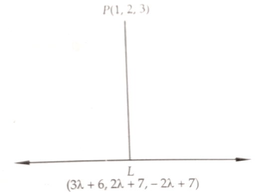 Let L be the foot of the perpendicular drawn from the point P(1, 2, 3) to the given line. Let the coordinates of L be $(3λ + 6, 2λ + 7, -2λ + 7)$ ........(i) ∴ Direction ratios of PL are proportional to $3λ + 6 - 1, 2 λ + 7 - 2, - 2λ + 7 - 3$ i.e. $ 3λ + 5, 2λ + 5, -2λ + 4 $ Direction ratios of the given line are proportional to 3, 2, -2 Since PL is perpendicular to the given line. $∴3(3λ + 5) + 2(2λ + 5) + (-2) (-2λ + 4) = 0 ⇒ λ = - 1$