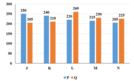 The bar graph given below shows the number of eraser sold by two shopkeeper P and Q in 5 months. Which of the following statement is NOT correct? I. The ratio of total number of eraser sold by P in J and K to the total number of eraser sold by Q in M and N is 93 : 98. II. The difference between the total number of eraser sold by P and Q is 0. |