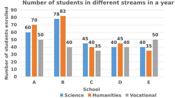 The number of students enrolled in different streams at Senior Secondary level in five schools is shown in the given bar graph. What is the total number of students enrolled in the Science stream in all the schools? |