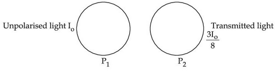 The intensity of the unpolarised is Io and intensity of the transmitted height is $\frac{3I_0}{8}$. The angle between axis of $P_1$ and $P_2$ is: