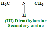 Hydrogen Bonding: Secondary amines have an \(NH\) group, allowing for hydrogen bonding, but not as extensive as in primary amines because there is only one NH group available for bonding. Dipole-Dipole Interactions: Present due to the polar \(NH\) group. Effect on Boiling Point: Secondary amines have hydrogen bonding but less extensive compared to primary amines, leading to a lower boiling point than primary amines. 3. N,N-Dimethylamine (III)