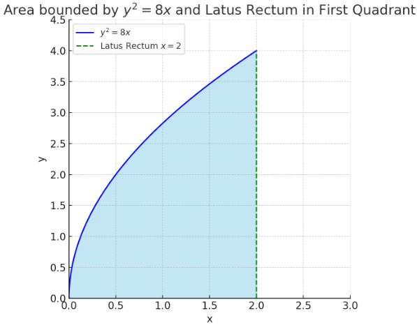 The correct answer is Option (4) → $\frac{16}{3}$ sq. units Given: Parabola $y^2 = 8x$ ⇒ $y = \sqrt{8x}$ in the first quadrant Latus rectum: $x = 2$ Calculate the area between $x = 0$ and $x = 2$ under the curve in terms of $dx$: Area = $\int_{x=0}^{2} y \, dx = \int_{0}^{2} \sqrt{8x} \, dx$ $= \int_{0}^{2} \sqrt{8} \cdot \sqrt{x} \, dx = \sqrt{8} \int_{0}^{2} x^{1/2} \, dx$ $= \sqrt{8} \cdot \frac{2}{3} x^{3/2} \Big|_0^2$ $= \sqrt{8} \cdot \frac{2}{3} \cdot (2)^{3/2}$ $= \frac{2}{3} \cdot \sqrt{8} \cdot \sqrt{8} = \frac{2}{3} \cdot 8 = \frac{16}{3}$ |