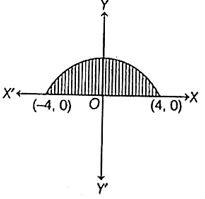 The correct answer is Option (1) → $8\pi$ sq units Given equation of curve is $y = \sqrt{16 - x^2}$ and the equation of X-axis i.e., $y = 0$. $∴\sqrt{16 - x^2} = 0 \quad \dots(i)$ $\Rightarrow 16 - x^2 = 0$ $\Rightarrow x^2 = 16$ $\Rightarrow x = \pm 4$ So, the intersection points are $(4, 0)$ and $(-4, 0)$. $∴\text{Required area of curve} = \int_{-4}^{4} (16 - x^2)^{1/2} dx$ $= \int_{-4}^{4} \sqrt{4^2 - x^2} dx$ $= \left[ \frac{x}{2} \sqrt{4^2 - x^2} + \frac{4^2}{2} \sin^{-1} \frac{x}{4} \right]_{-4}^{4}$ $= \left[ \frac{4}{2} \sqrt{4^2 - 4^2} + 8 \sin^{-1} \left( \frac{4}{4} \right) \right] - \left[ -\frac{4}{2} \sqrt{4^2 - (-4)^2} + 8 \sin^{-1} \left( \frac{-4}{4} \right) \right]$ $= [2 \times 0 + 8 \sin^{-1} (1)] - [-2 \times 0 + 8 \sin^{-1} (-1)]$ $= 8 \sin^{-1} \left( \sin \frac{\pi}{2} \right) - \left[ 8 \sin^{-1} \left( -\sin \frac{\pi}{2} \right) \right]$ $= 8 \times \frac{\pi}{2} - 8 \sin^{-1} \left[ \sin \left( -\frac{\pi}{2} \right) \right]$ $= 4\pi + 8 \times \frac{\pi}{2} = 8\pi \text{ sq. units.}$ |