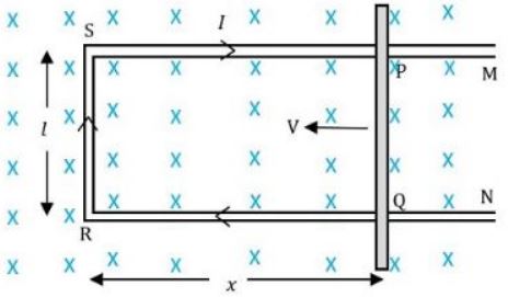Figure shows a rectangular conductor PQRS in which the conductor PQ is free to move. The conductor PQ is moved towards the left with a constant velocity V as shown in the figure. Assume that there is no loss of energy due to friction. What will be the magnetic flux linked with the loop PQRS and the motional emf? |