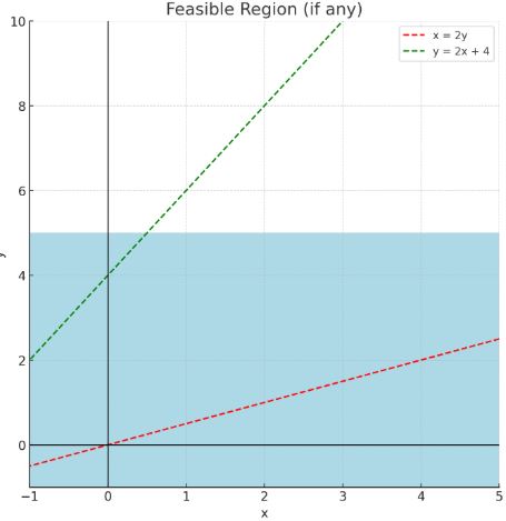 The correct answer is Option (1) → $\phi$ Given constraints: 1) $x - 2y \geq 0 \Rightarrow x \geq 2y$ 2) $2x - y \leq -4$ 3) $x \geq 0$, $y \geq 0$ Now analyze the feasible region step-by-step: From (1): $x \geq 2y$ (Region lies to the right of the line $x = 2y$) From (2): $2x - y \leq -4 \Rightarrow y \geq 2x + 4$ (Region lies above the line $y = 2x + 4$) Also, $x \geq 0$ and $y \geq 0$ means we are in the first quadrant. We combine these to get: $x \geq 2y$ and $y \geq 2x + 4$ Substitute $x = 2y$ into $y \geq 2x + 4$: $y \geq 2(2y) + 4 = 4y + 4$ ⟹ $y - 4y \geq 4$ ⟹ $-3y \geq 4$ ⟹ $y \leq -\frac{4}{3}$ But this contradicts $y \geq 0$. Conclusion: No feasible region exists that satisfies all constraints. Answer: The solution set is the empty set. |