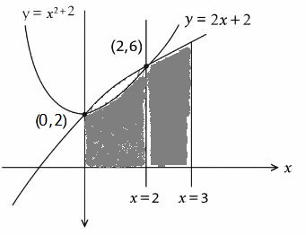 $\left\{(x, y): 0 ≤ y ≤ x^2+2,0 ≤ y ≤ 2 x+2,0 ≤ x ≤ 3\right\}$ |