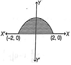 The correct answer is Option (3) → $2\pi$ square units Given region is $\{(x, y) : y = \sqrt{4 - x^2} \}$ and X-axis. We have, $y = \sqrt{4 - x^2} \Rightarrow y^2 = 4 - x^2 \Rightarrow x^2 + y^2 = 4 = (2)^2$ This is the equation of a circle with centre $(0, 0)$ and radius $2$. $∴$ Area of shaded region $= \int_{-2}^{2} \sqrt{4 - x^2} \, dx = \int_{-2}^{2} \sqrt{2^2 - x^2} \, dx$ $= \left[ \frac{x}{2} \sqrt{2^2 - x^2} + \frac{2^2}{2} \sin^{-1} \frac{x}{2} \right]_{-2}^{2} \quad \left[ ∵\int \sqrt{a^2 - x^2} \, dx = \frac{x}{2} \sqrt{a^2 - x^2} + \frac{a^2}{2} \sin^{-1} \frac{x}{a} \right]$ $= \frac{2}{2} \sqrt{2^2 - 2^2} + 2 \sin^{-1} \frac{2}{2} - \left( \frac{-2}{2} \sqrt{2^2 - (-2)^2} + 2 \sin^{-1} \left( \frac{-2}{2} \right) \right)$ $= 0 + 2 \sin^{-1}(1) - (0 + 2 \sin^{-1}(-1))$ $= 2 \sin^{-1} \left( \sin \frac{\pi}{2} \right) - 2 \sin^{-1} \left( -\sin \frac{\pi}{2} \right)$ $= 2 \times \frac{\pi}{2} - 2 \sin^{-1} \left[ \sin \left( -\frac{\pi}{2} \right) \right]$ $= \pi - 2 \left( -\frac{\pi}{2} \right) = 2\pi \text{ sq. units}$ |