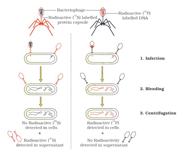 The correct answer is Option (1) -DNA of bacteriophage with radio active Phosphorous Alfred Hershey and Martha Chase conducted an experiment. In this Hershey and Chase experiment, they used the sulfur labeled proteins and phosphorous labeled DNA of the phage. These phages were then allowed to infect bacteria. It was observed that the DNA entered the bacterial cells and was therefore concluded to be the genetic material. The progeny of the phages that were labeled with radioactive phosphorus remained labeled whereas the progeny of the phages labeled with radioactive sulfur were unlabeled. This confirmed that DNA and not protein is the genetic material. The Hershey-Chase experiment |