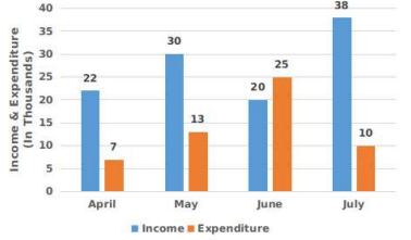 Total Income = 22+30 + 20 + 38 = 110 thousand Total Expenditure = 7 + 13 + 25 10 = 55 thousand Required percentage = \(\frac{550 }{1100}\) × 100 = 50% |