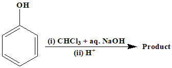 The correct answer is option 4. Salicylaldehyde. The given reaction is Reimer-Tiemann Reaction. Reimer Tiemann reaction is a type of substitution reaction named after chemists Karl Reimer and Ferdinand Tiemann. The reaction is used for the ortho-formylation of \(C_6H_5OH\) (phenols). When phenol, i.e. \(C_6H_5OH\), is treated with \(CHCl_3\) (chloroform) in the presence of \(NaOH\) (sodium hydroxide), an aldehyde group \((-CHO)\) is introduced at the ortho position of the benzene ring leading to the formation of o-hydroxybenzaldehyde. The reaction is popularly known as the Reimer Tiemann reaction.
