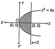 The correct answer is Option (2) → $\frac{32}{3}$ square units We have, $y^2 = 8x$ and $x = 2$. $∴$ Area of shaded region $= 2 \int\limits_{0}^{2} \sqrt{8x} \, dx = 2 \cdot 2\sqrt{2} \int\limits_{0}^{2} x^{1/2} \, dx$ $= 4 \cdot \sqrt{2} \left[ \frac{x^{3/2}}{3/2} \right]_{0}^{2} = 4\sqrt{2} \left[ \frac{2}{3} \cdot 2\sqrt{2} - 0 \right]$ $= \frac{32}{3} \text{ sq. units}$ |