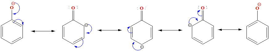 Phenol has a hydroxyl group directly attached to the benzene ring. Upon losing a proton, phenol forms a phenoxide ion (\(C_6H_5O^-\)). The negative charge on the oxygen can be delocalized into the aromatic ring through resonance. This delocalization spreads the negative charge over the oxygen and carbon atoms in the ring, stabilizing the conjugate base. Resonance Structures: