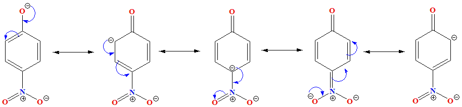 p-Nitrophenol has a nitro group \((-NO_2)\) at the para position relative to the hydroxyl group on the benzene ring. The nitro group is a strong electron-withdrawing group, and it exerts its effect through both resonance and inductive effects: The nitro group pulls electron density away from the benzene ring and the oxygen atom, which stabilizes the negative charge on the oxygen in the conjugate base. The electron-withdrawing nature of the nitro group stabilizes the phenoxide ion further by decreasing the electron density around the oxygen. Stabilization of the Conjugate Base: