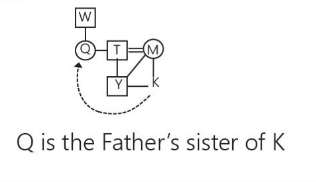 A # B means 'A is the sister of B'. A @ B means 'A is the son of B'. A & B means 'A is the father of B'. A % B means 'A is the mother of B'. If W & Q # T & Y @ M % K, then how is Q related to K ? |