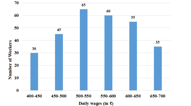 Study the given graph which shows the number of workers with their daily wages and answer the question that follows. What is the ratio of the total number of workers whose daily wages are ₹450 or above but less than ₹500 to the total number of workers whose daily wages are ₹650 or above? |
