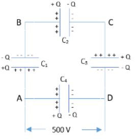 The correct answer is Option (2) → (A), (B) and (C) only Given: Four capacitors each $C = 9 \, \mu F$ connected to a $500 \, V$ source. Analysis: 1. $C_{1}, C_{2}, C_{3}$ form a series combination between nodes A and D. $\frac{1}{C_{eq}} = \frac{1}{C_{1}} + \frac{1}{C_{2}} + \frac{1}{C_{3}}$ $\frac{1}{C_{eq}} = \frac{1}{9} + \frac{1}{9} + \frac{1}{9}$ $\frac{1}{C_{eq}} = \frac{3}{9} = \frac{1}{3}$ $C_{eq} = 3 \, \mu F$ 2. $C_{4}$ is connected directly across A and D, i.e. in parallel with the series combination of $C_{1}, C_{2}, C_{3}$. Total equivalent capacitance: $C_{total} = C_{4} + C_{eq} = 9 + 3 = 12 \, \mu F$ 3. Charge on $C_{4}$: $Q_{4} = C_{4} \times V = 9 \times 10^{-6} \times 500 = 4.5 \times 10^{-3} \, C$ 4. Charge on $C_{1}$: Voltage across series combination = $500 \, V$ Equivalent capacitance = $3 \, \mu F$ Total charge = $Q = C_{eq} \times V = 3 \times 10^{-6} \times 500 = 1.5 \times 10^{-3} \, C$ In series, all capacitors carry the same charge, so $Q_{1} = Q_{2} = Q_{3} = 1.5 \times 10^{-3} \, C$ Now check statements: (A) True → $C_{4}$ is in parallel with series of $C_{1}, C_{2}, C_{3}$. (B) True → Equivalent capacitance = $12 \, \mu F$. (C) True → Charge on $C_{4} = 4.5 \times 10^{-3} \, C$. (D) False → $Q_{1} = 1.5 \times 10^{-3} \, C \neq Q_{4} = 4.5 \times 10^{-3} \, C$. Correct statements: (A), (B), (C) |