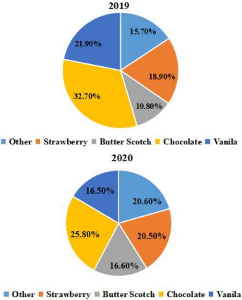 Combined Strawberry, other and Butterscotch sales in 2019 = 15.70% + 18.90% + 10.80% = 45.4% combined Strawberry, other and Butterscotch sales in 2020 = 20.60% + 20.50% + 16.60% = 57.7% Combined increase in sale of Strawberry, other and Butterscotch sales from 2019 to 2020 = 57.7% - 45.4% = 12.3% ATQ , 1% increase in sale = Additional sale of Rs.10000 So , with increase in 12.3% sale , Additional sale is = 12.3 × 10000 = 123000 |