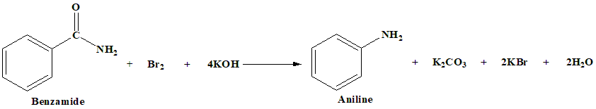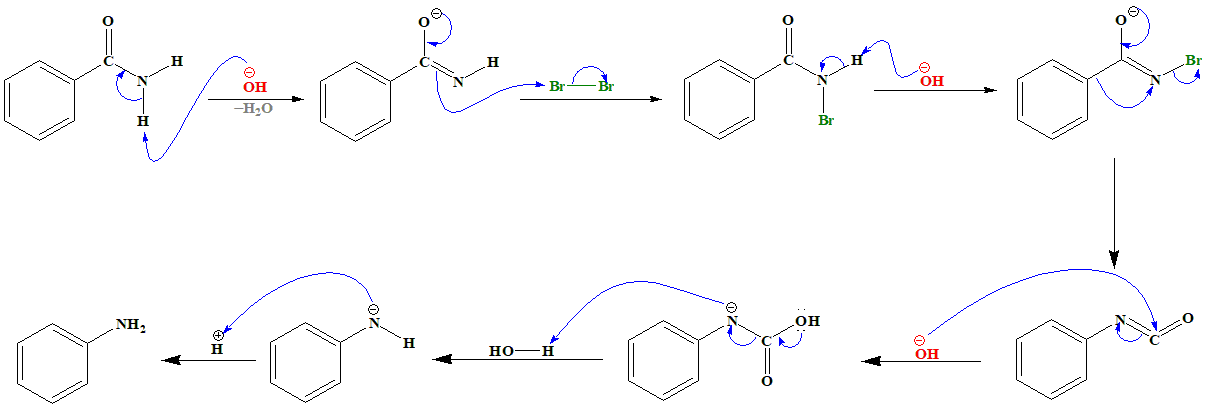 The general mechanism for the conversion of benzamide to aniline is as shown below, 1. Base such as potassium hydroxide and sodium hydroxide attacks on the amide. Base abstracts protons from benzamide. 2. In the next step the anion reacts with the bromine molecule. This generates N-bromobenzamide.This is an alpha substitution reaction. 3. Next base molecule abstracts a proton from the amide group to generate a bromamide anion. 4. Fourth step involves the rearrangement of bromoimide anion such that the benzyl \(Ar\) group migrates to the nitrogen atom. This leads to the formation of isocyanate. 5. In the next step water molecules are added to the isocyanate to form carbamic acid. On heating carbamic acid loses carbon dioxide and leads to the formation of primary amine i.e. Aniline. The mechanistic pathways for benzamide to aniline are as shown below: