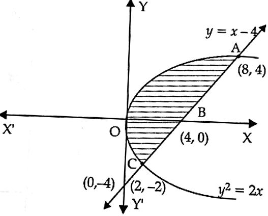 The correct answer is Option (1) → 18 Given: $y^2 = 2x \dots (i)$ $y = x - 4 \dots (ii)$ Required area is $OABCO$ from $(i)$ and $(ii)$: $(x - 4)^2 = 2x$ $x^2 - 10x + 16 = 0$ $(x - 8)(x - 2) = 0$ $x = 8 \text{ and } x = 2$ $∴\text{ Intersection points } (2, -2) \text{ and } (8, 4)$ Required Area: $\int_{-2}^{4} \left[ (y + 4) - \frac{y^2}{2} \right] \, dy = \left[ \frac{y^2}{2} + 4y - \frac{y^3}{6} \right]_{-2}^{4}$ $= \left( 8 + 16 - \frac{32}{3} \right) - \left( 2 - 8 + \frac{4}{3} \right)$ $= 30 - 12 = 18 \text{ unit}^2$ |