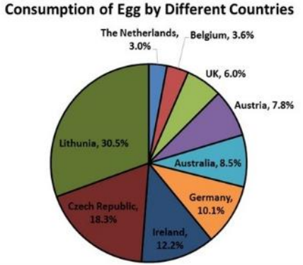 The Pie chart given below presents the percentage figures of consumption of eggs, with reference to the total consumption made by nine different countries. What is the central angle (nearest to 0.1 degree) of the sector for Lithuania? |