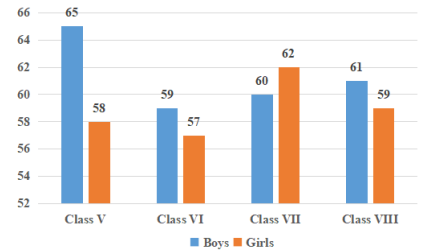 Total students in class V = 65 + 58 = 123 Total students in class VI = 59 + 57 = 116 Total students in class VII = 60 + 62 = 122 Total students in class VIII = 61 + 59 = 120 So , Class VI has least number of students. |