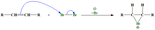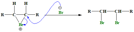 Nucleophilic Attack: The bromide ion (\(Br^-\)) formed in the first step then attacks the more substituted carbon of the bromonium ion intermediate, leading to the formation of the vic-dibromide product.