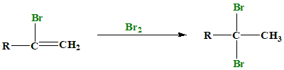 The result is a vic-dibromide, where each of the original alkene carbons now has a bromine atom attached, and the product is a 1,2-dibromide with the bromine atoms on adjacent carbons (vicinal positions). (C) Alkylidene halides (II) gem-dibromide: Alkylidene halides are compounds where a carbon atom is doubly bonded to a halogen atom, with the general formula \(R-C(X)=CH_2\), where X can be a halogen like chlorine or bromine. The term "gem-dibromide" refers to a compound where two bromine atoms are attached to the same carbon atom. This is also known as a geminal dibromide. Here is how alkylidene halides relate to gem-dibromides: Alkylidene Halides: These are typically compounds where a carbon-carbon double bond is adjacent to a halogenated carbon. Gem-dibromide: This term specifically describes a molecule where two bromine atoms are attached to the same carbon atom, resulting in a geminal dihalide structure. In a typical reaction, an alkylidene halide (such as an alkene with a halogen attached to one of the carbons) can react with another halogenating agent to form a gem-dibromide. For example, if you start with an alkylidene halide like \(R-C(Br)=CH_2\) and react it with another bromine source, you can form a gem-dibromide: