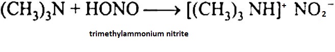 The correct answer is Option (1) → Primary amine Primary amines react with nitrous acid (HONO) to form unstable diazonium salts which decompose to release nitrogen gas ($N_2$). This is a characteristic reaction used to distinguish primary amines from secondary and tertiary amines. Explanation Option 1: Primary amine Primary aliphatic amines react with nitrous acid to form diazonium salts. These salts are unstable and immediately decompose to produce alcohol along with evolution of nitrogen gas. The liberation of $N_2$ is a key identifying feature of primary amines. $CH_3NH_2 + 2HONO \longrightarrow \underset{methylnitrite} {CH_3ON=O}+ N_2 + 2H_2O$ $2CH_3NH_2 + 2HONO \longrightarrow CH_3OCH_3 + 2N_2 + 2H_2O$ Option 2: Secondary amine Secondary amines react with nitrous acid to form N-nitrosamines. These compounds are stable oily substances and do not release nitrogen gas. Hence, no $N_2$ evolution occurs in this reaction. Secondary amines will form nitroso alkyl amine. Option 3: Tertiary amine Tertiary amines do not form diazonium salts because they lack a hydrogen attached to nitrogen. Instead, they form nitrite salts or undergo mild reactions without gas evolution. Therefore, nitrogen gas is not produced. Tertiary amines react with nitrous acid and form nitrites. Option 4: Quaternary ammonium salt Quaternary ammonium salts do not react with nitrous acid in a way that produces nitrogen gas. Their nitrogen is fully substituted and cannot undergo diazotization, so no $N_2$ is evolved. |