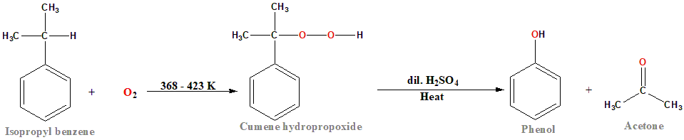 The correct answer is option 2. Isopropyl benzene. Cumene, chemically known as isopropylbenzene, is an organic compound with the chemical formula \(\text{C}_9\text{H}_{12}\). It consists of a benzene ring substituted with an isopropyl group (\( \text{CH}_3\text{-}CH(\text{CH}_3)\text{-}\)). The synthesis of phenol from cumene involves a process known as cumene hydroperoxide process or Hock process. Here's a brief explanation of the process: 1. Oxidation of Cumene: Cumene is oxidized using oxygen or air in the presence of an acid catalyst, typically a solid acidic catalyst like aluminum silicate supported by a metal oxide. This oxidation reaction forms cumene hydroperoxide (\( \text{C}_6\text{H}_5\text{-}CH(\text{CH}_3)\text{-}\text{OOH} \)). 2. Cleavage of Cumene Hydroperoxide: The cumene hydroperoxide is then subjected to cleavage in the presence of an acid catalyst, which breaks the O-O bond, yielding phenol and acetone as the main products. The overall reaction can be represented as follows: