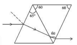 Two prism made of material of same refractive index and having angles of the prism 65° and 60° respectively are combined to form a glass block as shown. If for any ray passing across the block the minimum angle of deviation in 3° then refractive index for the material of the prism is |