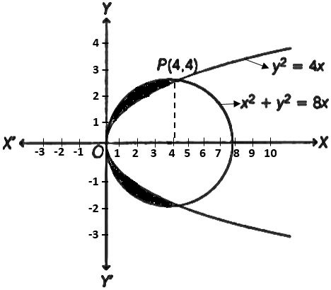 Find the area lying above x-axis and included between the circle x2 + y2 = 8x and inside of the parabola y2 = 4x. |